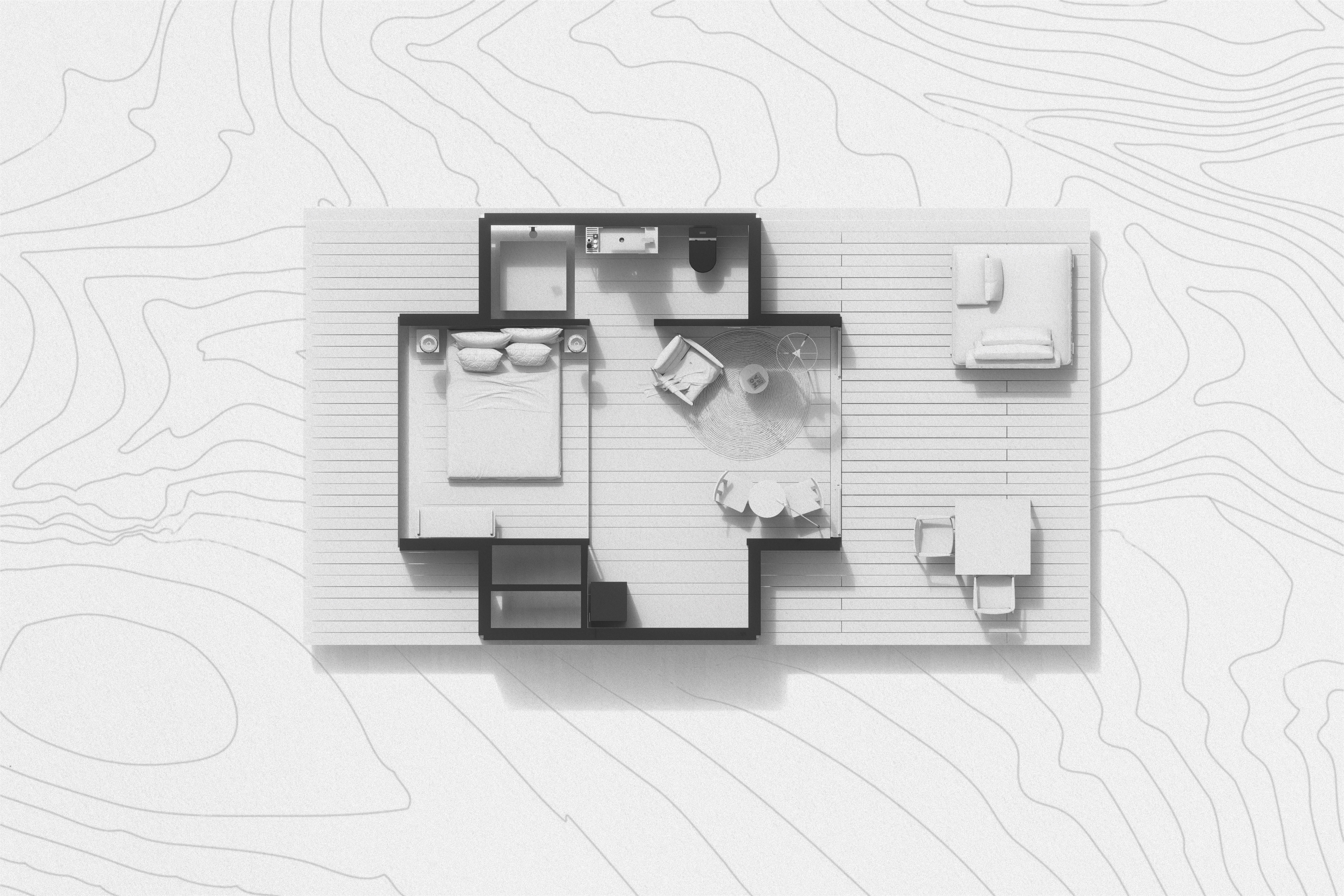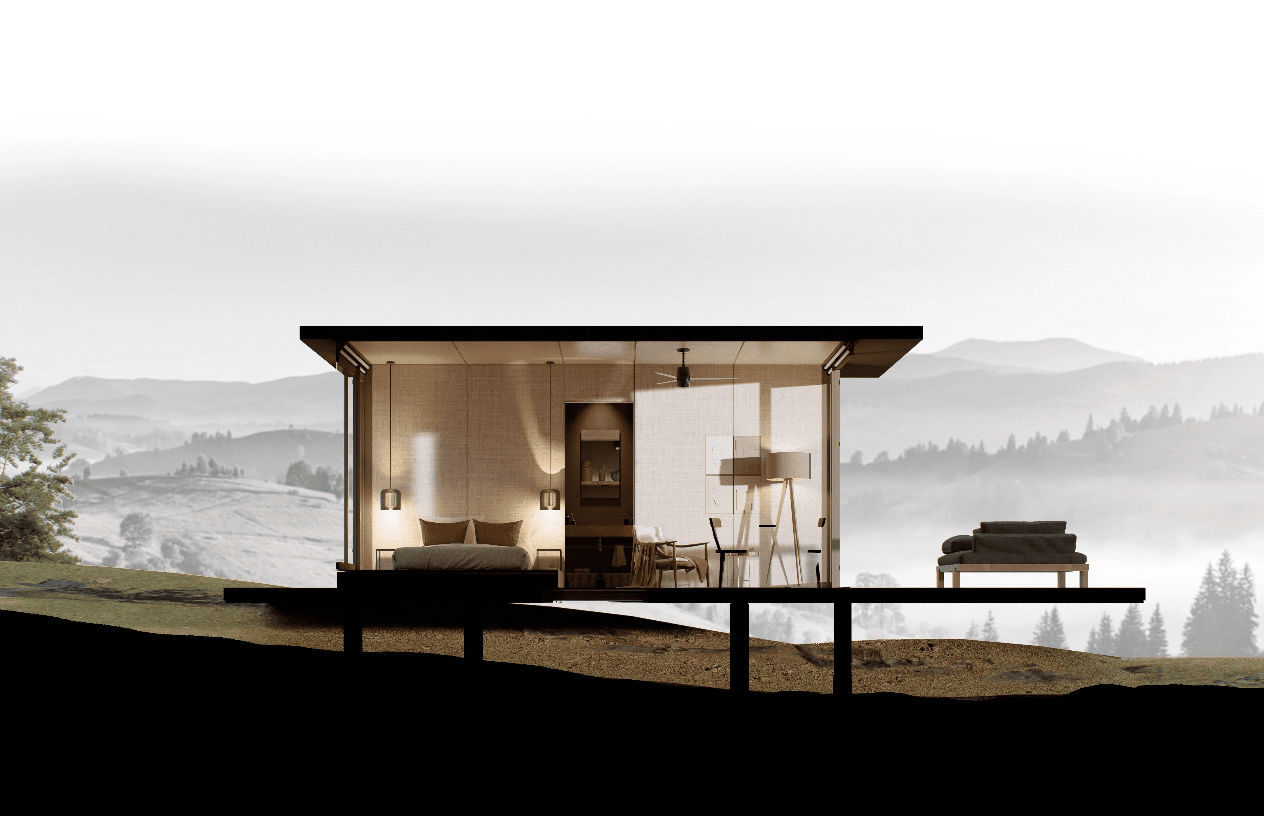 Cross Cabin is conceived as a compact dwelling where space, structure, and movement are resolved with precision. Its proportions and layout make it ideal for inhabiting the landscape without excess.