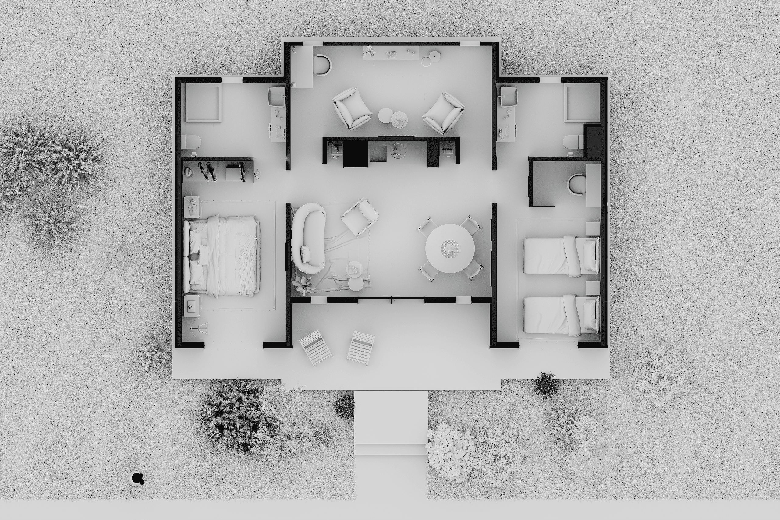 By combining two I Cabins and integrating a generous shared living area, the house achieves a clear balance between private and communal spaces.